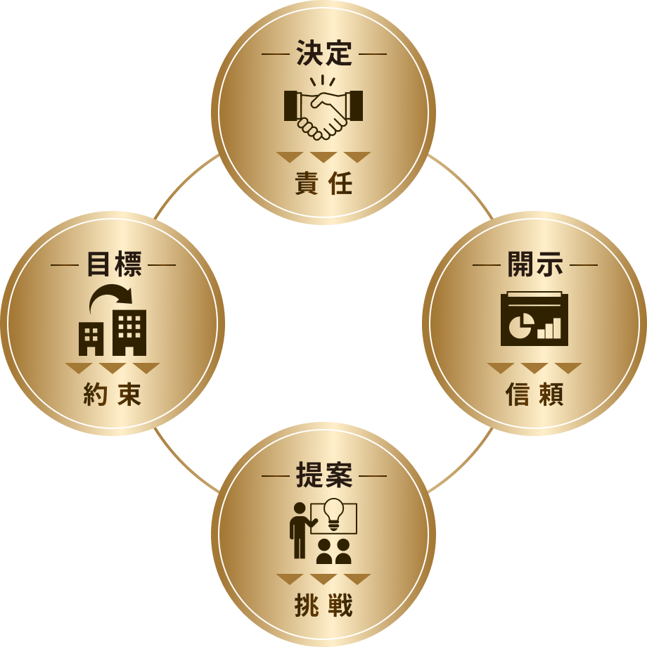 上記のビジョンを達成するため、私たちは決定・開示・提案・目標という4信条を心がけています。決定は責任に、開示は信頼に、提案は挑戦に、目標は約束につながっています。ビジョンを実現する過程で、わたしたちも再び生まれ変われると信じています。
